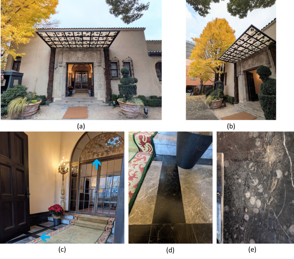 重厚な造りの正面玄関。葡萄棚をデザインしたひさし(a), (b)や小鳥のモチーフの明かり取り((c)の↑)の見どころと共に、(c)の←の床面にフズリナと思われる化石を早速見つけました(d), (e)。