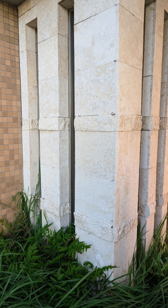 下町風情が残る墨田区向島エリア。以前、老舗和菓子屋さんへ行こうと、堤通(つつみどおり)に面したコインパーキング「タイムズ堤通」を利用したところ…入り口脇の壁面に琉球石灰岩 が使われていることに気づいてしまいました👀