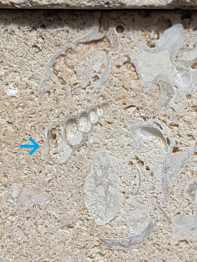 マンション敷地の一角を利用した駐車場のため、短時間でさっと…の観察でしたが、サンゴや巻き貝の化石に太陽の光が差し込み、くっきりと立体的に見られました。