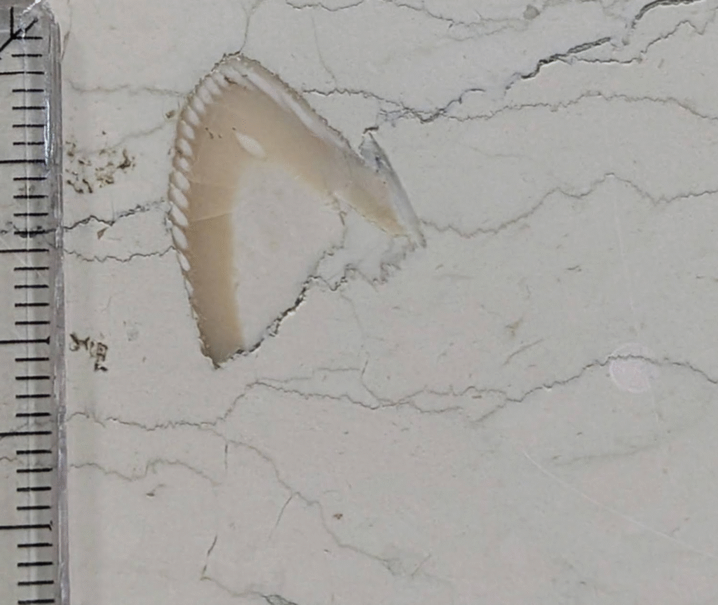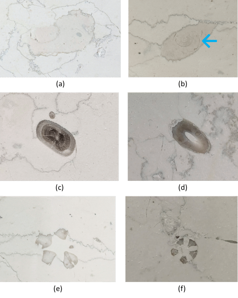 (9)の← の化石も加工の段差にまたがって見えていて面白い😊