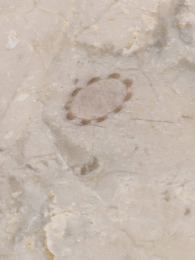 (4)も入口前の床面のサンゴ化石で□を拡大した物が(5)、□が(6)です。